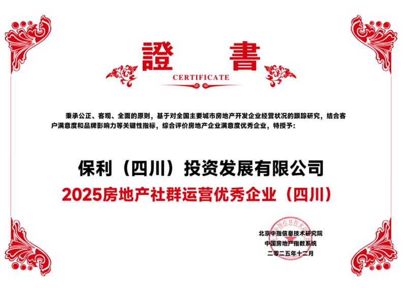 从“造房子”到“造生活”,保利四川优秀的社群运营能力与和人文创新的社区服务力,不仅能显著提升居住体验、夯实物业口碑,更能间接保障资产价值的稳定,最终构筑起“好房子+好服务”的良性闭环,并于2025年12月11日,在由北京中指信息技术研究院主办,中国房地产指数系统、中国物业服务指数系统承办的“2025中国房地产大数据年会暨2026中国房地产市场趋势报告会”上获评“2025房地产社群运营优秀企业”。