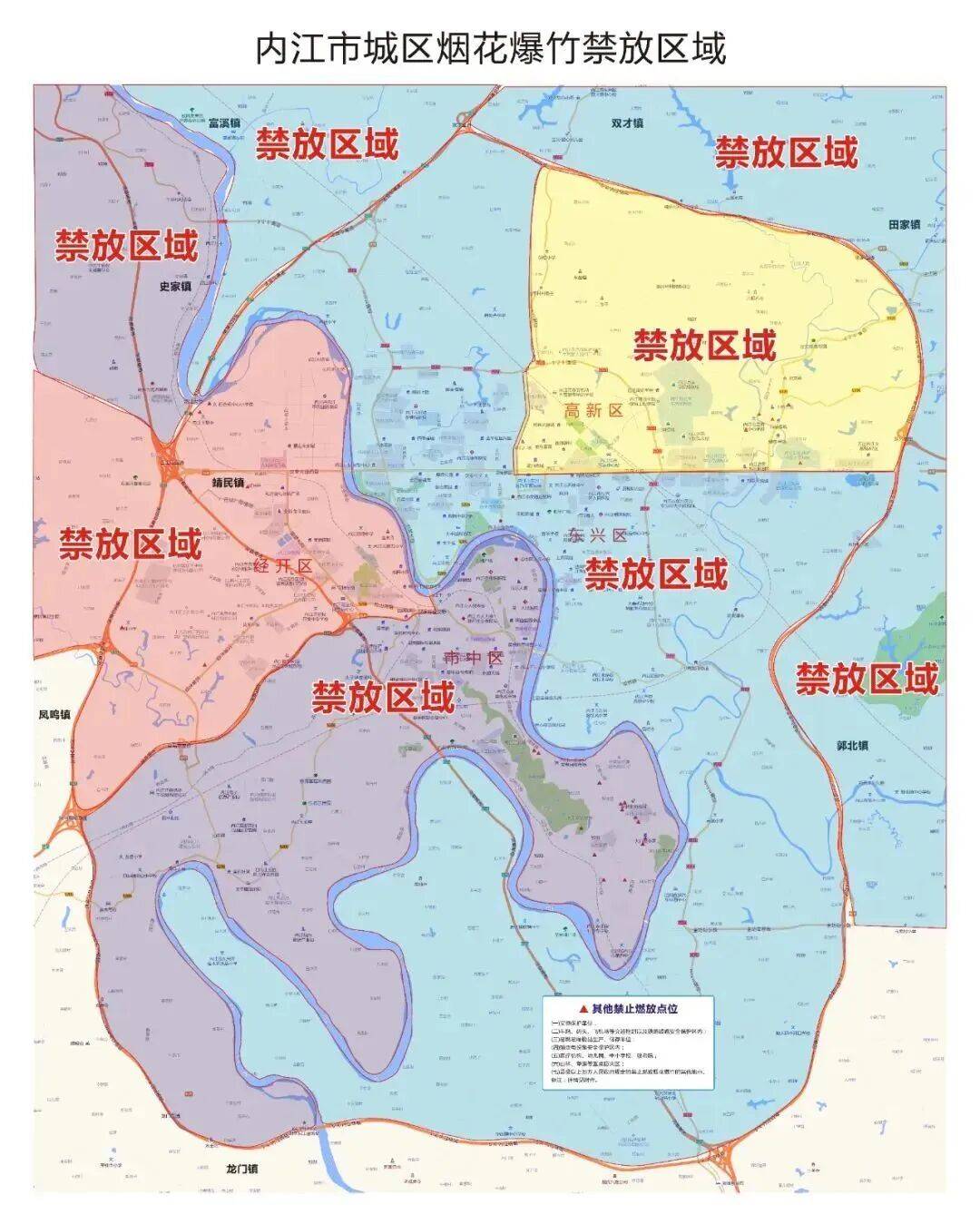 (一)内江市中心主城区(市中区、东兴区、经开区、高新区)以SK内江绕城高速为界,高速路内侧区域全域全时段禁放;邻近SK内江绕城高速的史家、富溪、双才、田家、郭北和靖民镇全域全时段禁放。