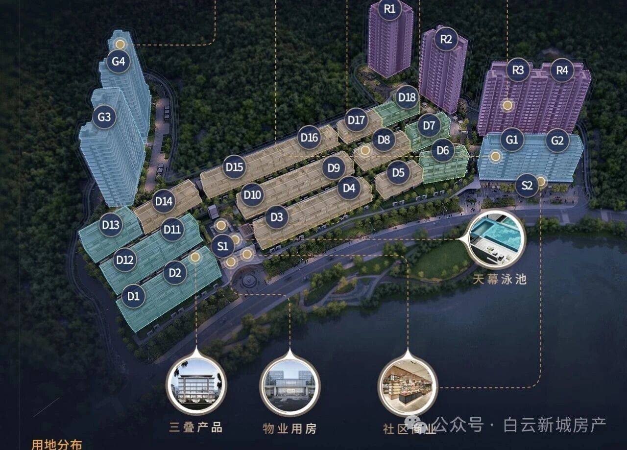 项目由4栋高层住宅、2栋小高层洋房以及18栋叠墅组成,形成了高低错落、疏密有致的建筑群落布局。其中,叠墅产品占据了项目的核心景观资源位,临湖而建,背靠青山,视野开阔,私密性强。小高层和高层住宅则分布在项目的两侧,既保证了采光通风,又避免了相互遮挡,确保了每一户都能享受到最佳的景观视野。
