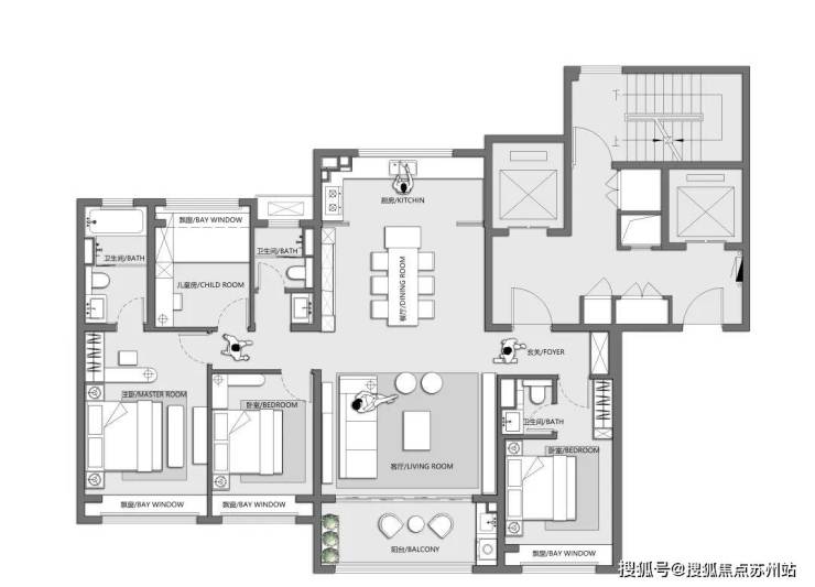 这个户型有双重入户设计,电梯前室搭配入户玄关,一进门就能感受到优雅的归家氛围。南向三开间面宽约12.3米,让家里充满阳光。四间卧室都设计了飘窗,布局合理,能保证每个房间都有私密空间。客厅和餐厅形成宽幅双厅,通透的空间可以满足多种生活场景的需求。两个卫生间都是全明设计,干湿分离,既能满足主人的需求,也能照顾到客人的需要。