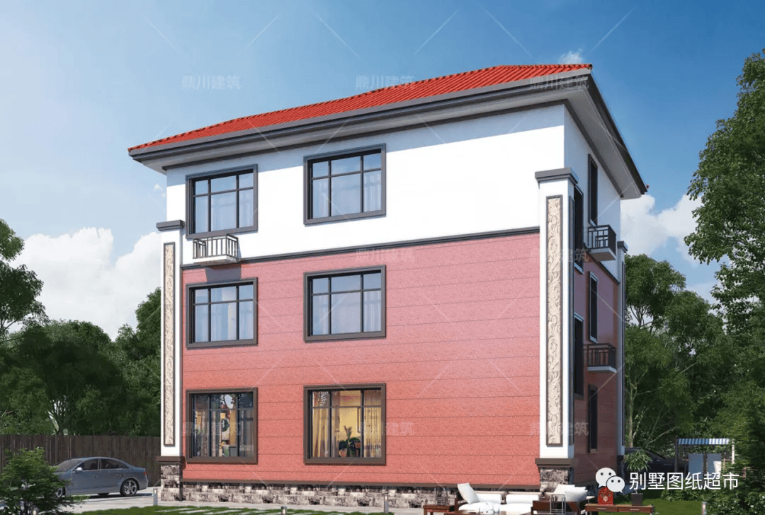 复式户型,外观配色亮眼,橘红色的屋顶,让整个外观更大气,建一栋这样的乡村别墅,在农村一定争相效仿。室内功能也很强大,三层的设计足够自住和待客了,占地面积也非常适用于农村。