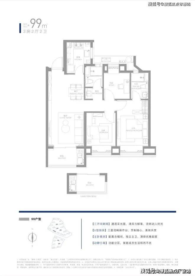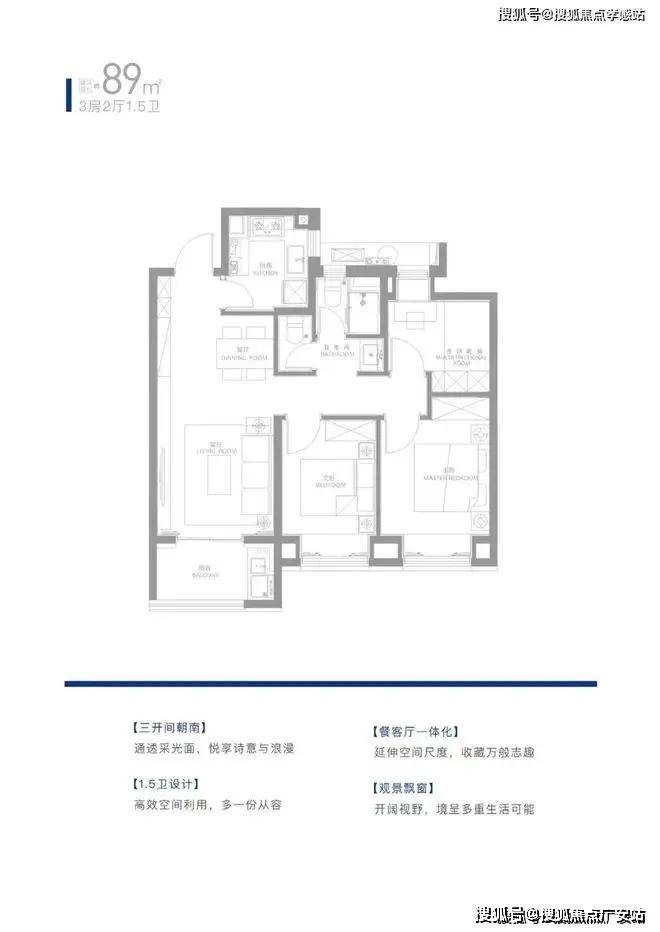 3开间朝南+5飘窗设计,空间利用到极致;主卧套房带独卫+衣帽间,尊享私密性和尺度感。
