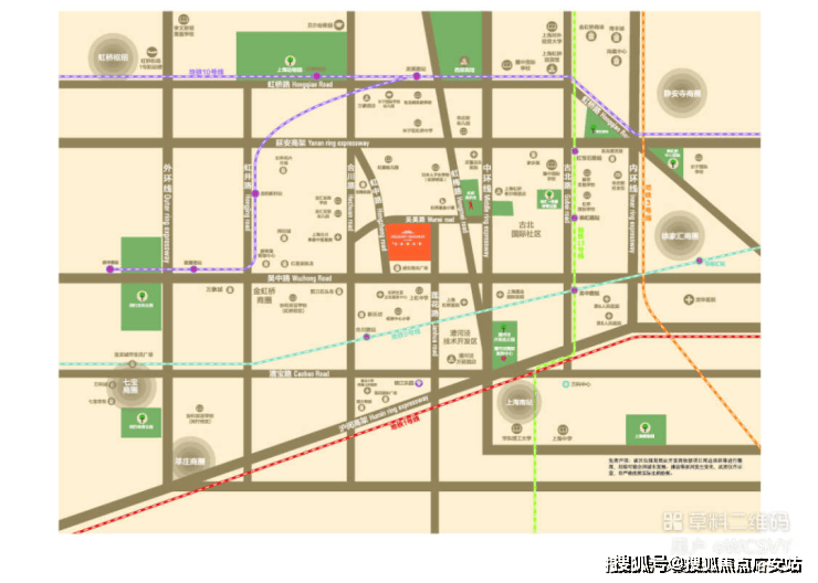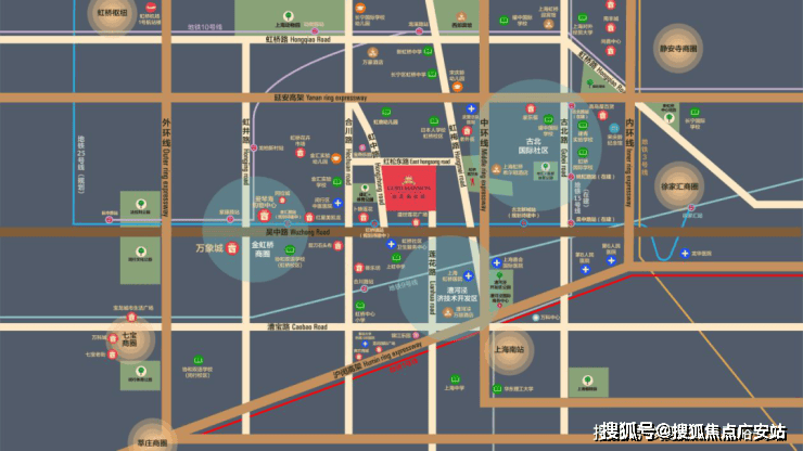 板块上属于属于金虹桥,距中环线米,位于闵行区虹中路近红松路,步行到10号线公里。交通配套方面:项目地处长宁、徐汇、闵行三区交汇的金虹桥板块的核心区位,拥有多维立体的交通,延安高架、中环线、外环线环伺。
